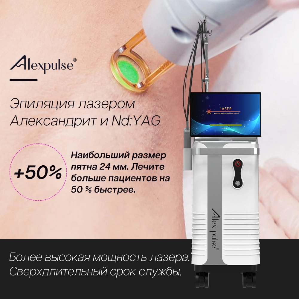 Машина лазера Александрита выделяется своей универсальностью: она эффективна для обработки больших зон, таких как ноги, спина или бикини, благодаря большому размеру пятна — до 24 мм. Это позволяет сократить время сеанса на 50% по сравнению с устаревшими системами. Для клиентов с светлой кожей (типы I-III по Фитцпатрику) это “золотой стандарт”, так как высокая абсорбция меланина гарантирует видимые результаты уже после 3–4 процедур. Более того, интегрированная технология Nd:YAG 1064 нм расширяет спектр применения, делая устройство подходящим для более широкого диапазона тонов кожи.