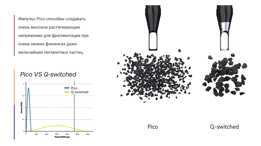 Эффективность пикосекундного лазера позволяет удалять огромные объемы пигментов татуировки и даже самые тугоплавкие пигменты. Клиническая практика показала, что пикосекундные лазеры лучше всего использовать для удаления частиц пигмента. Наносекундные импульсы разрушают крупные частицы пигмента, а пикосекундные импульсы — мелкие частицы.