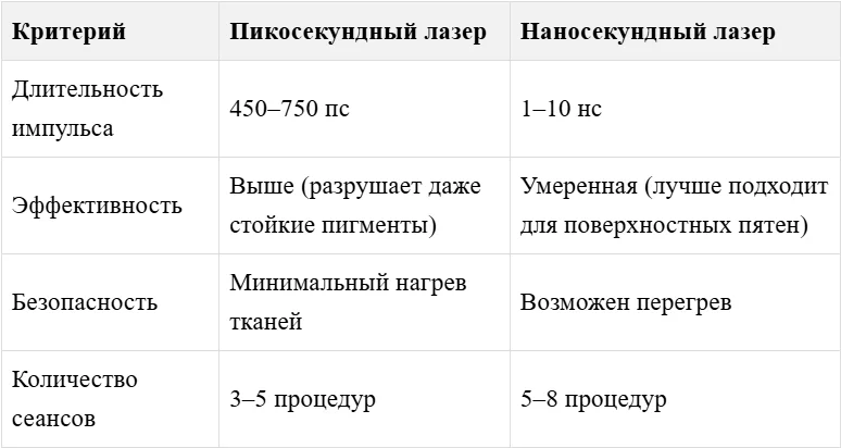Наносекундные лазеры (1 наносекунда = 10⁻⁹ секунды) действуют медленнее, чем пикосекундные, но все же эффективны при: