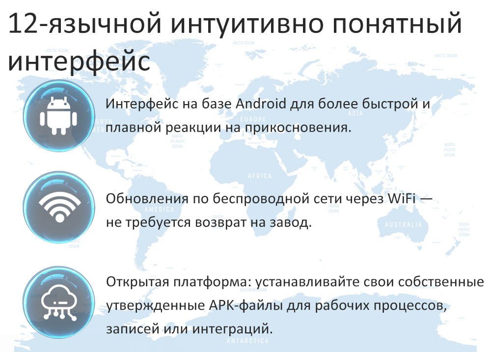 Android: сенсорный экран, обновления по Wi-Fi «по воздуху» (без возврата на завод), поддержка сторонних APK и многоязычный интерфейс с поддержкой ИИ — 12+ языков с возможностью расширения.