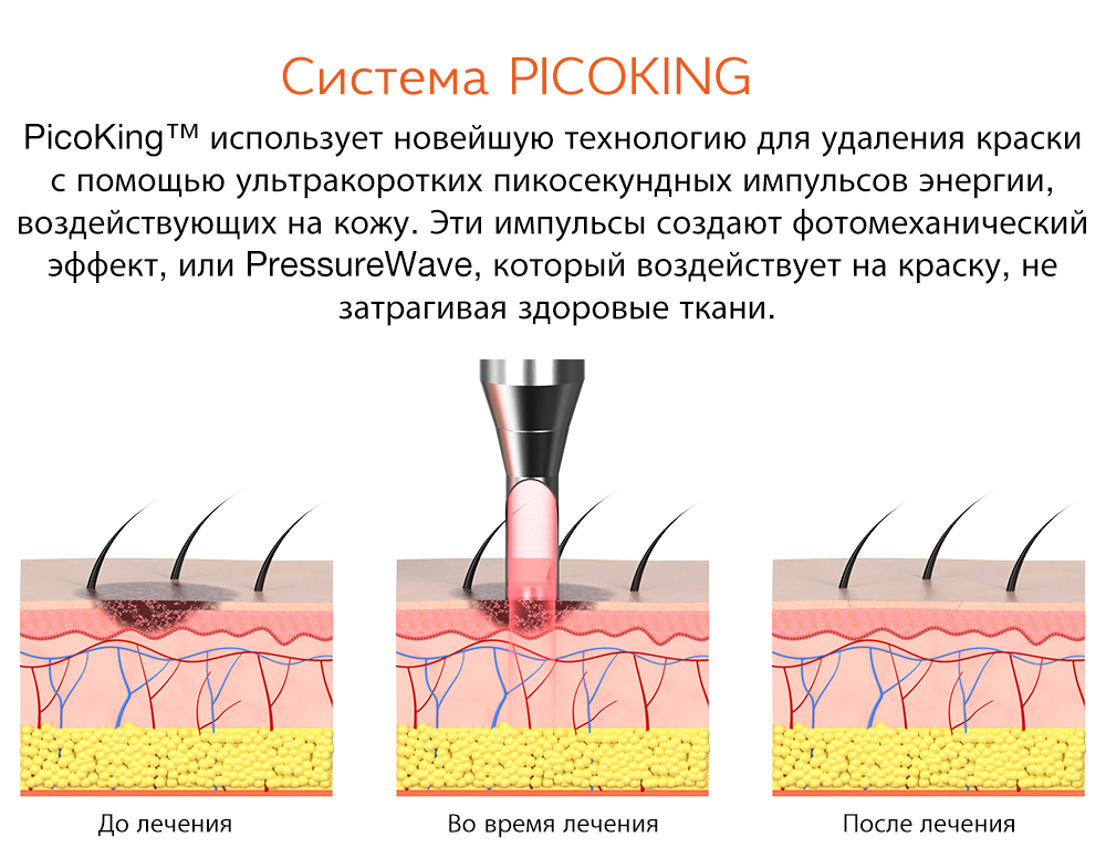 PicoKing использует самые передовые технологии для удаления пигментов татуировок, доставляя в кожу ультракороткие пикосекундные импульсы энергии. Эти импульсы создают фотомеханический эффект, или «Ударную Волну» (PressureWave), которая воздействует именно на чернила, не затрагивая непомеченные ткани.