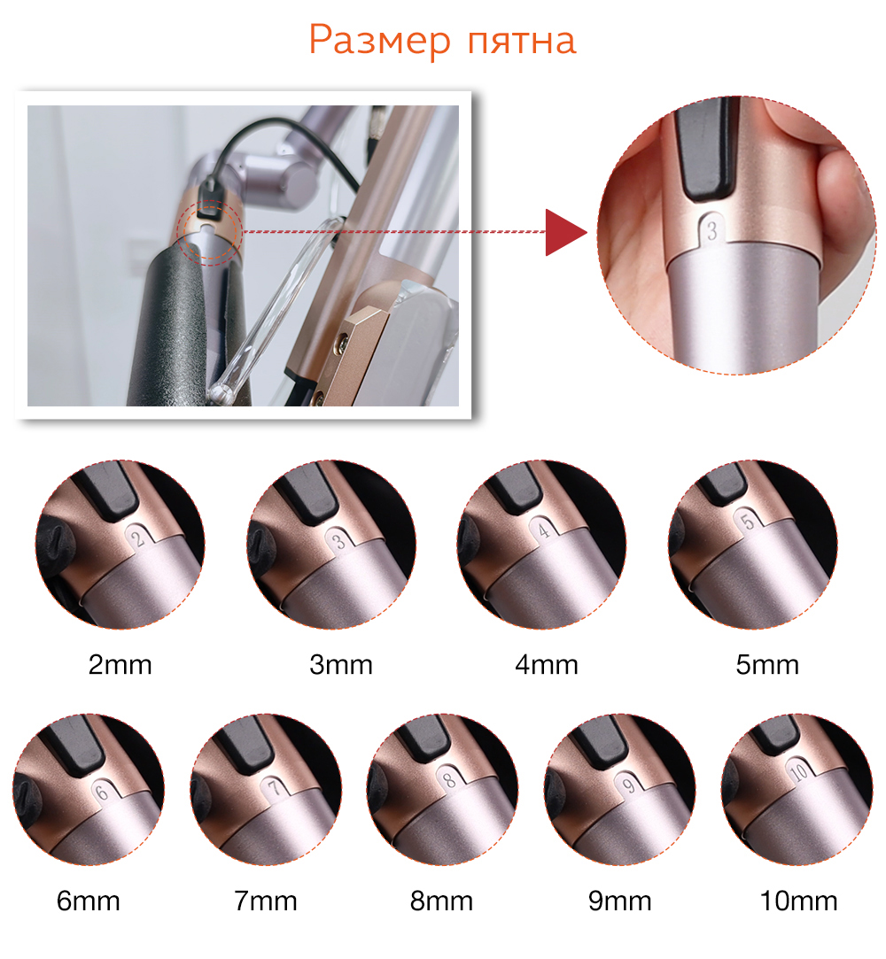 PicoKing™ предлагает размер светового пятна (спота) до 10 мм, в диапазоне от 2 мм до 10 мм. Бóльшие размеры пятна обеспечивают более глубокое проникновение в дерму и лучшее рассеивание энергии.