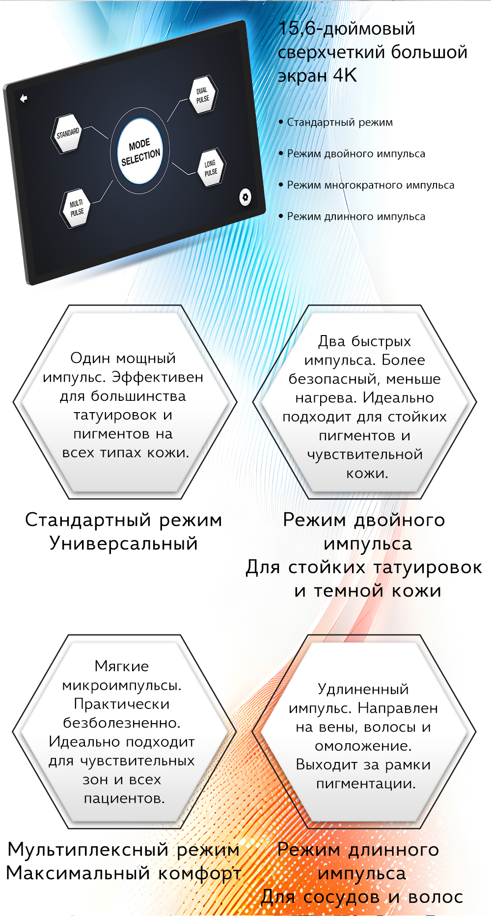 • Единственный на рынке пикосекундный лазер, объединяющий четыре режима лечения: