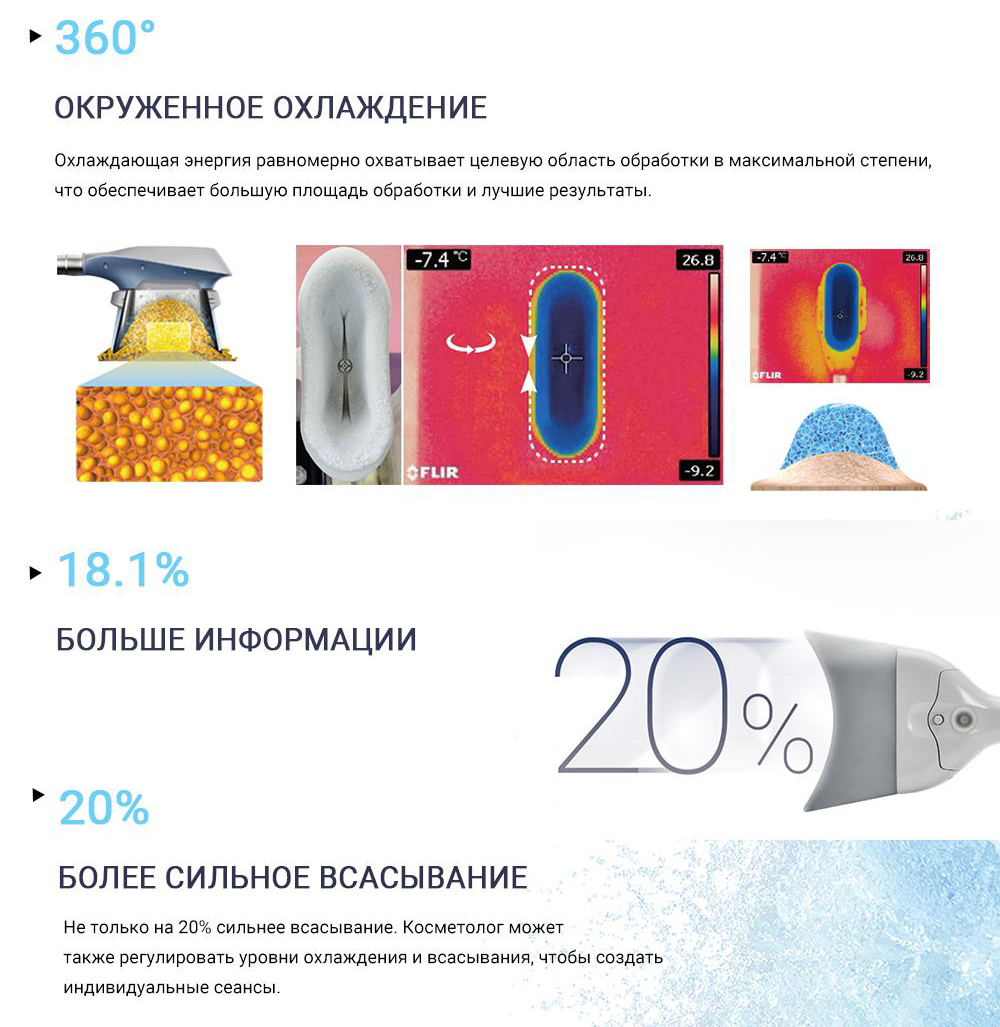 • Регулируемая интенсивность охлаждения (1-5 уровней) и вакуумного воздействия (+20% к силе всасывания).